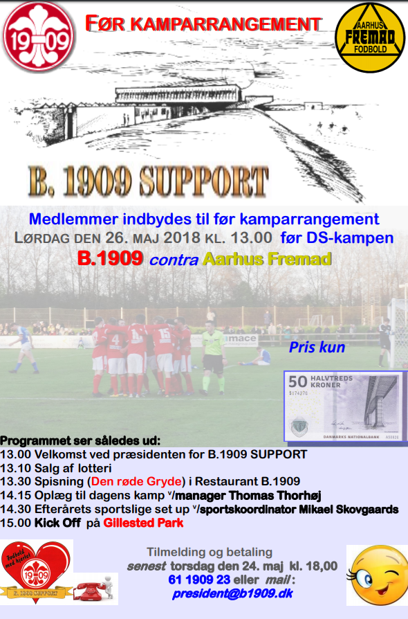 Tag med til Ærø1 Kommentarer 17-08-2016 11:46 Søndag den 28. august 2016, gæster B1909 Ærø og Marstal/Rise i Albaniserien. Som sædvanligt laver vi et cruise i det Sydfynske øhav, til e Deltag i førkampsarrangement før B1909-TuseSkrevet af HBR 24-03-2016 16:09 I forbindelse med årets første hjemmekamp i Danmarksserien, hvor Tuse gæster Gillested Park, afholder B.1909 SUPPORT endnu et af de populære førkampsarrangementer, for Deltag i fællesspisning med førsteholdetSkrevet af HBR 10-03-2016 18:30 Som optakt til forårssæsonen, inviterer B.1909 SUPPORT medlemmer og førsteholdstruppen til fællesspisning i klubbens restaurant. Arrangementet afholdes torsdag den 17. marts 20 Generalforsamling: Genvalg over hele linienSkrevet af HBR 09-03-2016 11:25 Tirsdag aften blev foreningens 19. ordinære generalforsamling afviklet, og traditionen tro blev det en ganske rolig og hyggelig aften. Omkring 20 supportere var mødt frem, og deltog aktiv Reminder: Generalforsamling 8/3 2016Skrevet af HBR 05-03-2016 09:22 Indkaldelsen til årets generalforsamling i B.1909 SUPPORT, blev udsendt med december-udgaven af medlemsbladet, DE RØDE.